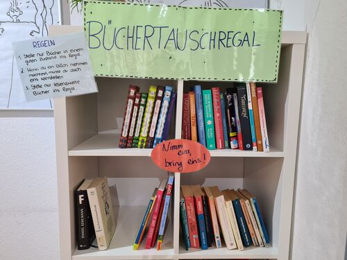Ab sofort gibt es in der Schülerbücherei ein Büchertauschregal. Es funktioniert nach dem Prinzip „Bring ein Buch und nimm dir ein Buch!“ Einfach von zu Hause ein Buch mitbringen, das man aussortiert hat. Man stellt es ins Regal und darf im Gegenzug dafür ein anderes, gleichwertiges Buch aussuchen und mitnehmen.