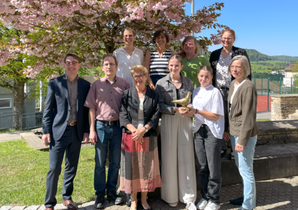 Die besinnliche Gedenkminute für die weltweiten Opfer von kriegerischen Konflikten leitete einen feierlichen Moment ein: Heidrun Günther-Weißbeck vom Elly-Heuss-Knapp-Gymnasium in Heilbronn, einer Partner-Weltethos-Schule, überreichte uns die Statuette der „Weltethos-Friedenstaube“, die nun unser Schulhaus schmückt und uns täglich in unserer Verantwortung für friedliches Zusammensein begleitet. Unser Schulleiter Herr Dr. Heß rundete den feierlichen Moment mit seinen Dankes-Worten ab.