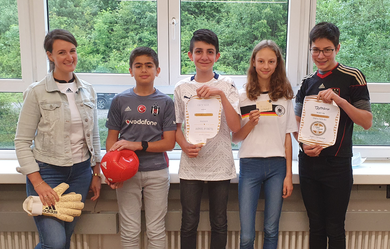 Absolut verdient gewonnen hat Emily Niethammer aus der 7a mit 116 Punkten, dicht gefolgt von Felix Stopper aus der 7b mit 110 Punkten und Fabio Gaggiano, ebenfalls aus der 7b, mit 108 Punkten. Als beste Lehrerin tippte Frau Krückmann die meisten Partien, Spielstände und Bonusfragen richtig. Sie erkämpfte sich 108 Punkte und teilt sich mit Fabio den Bronze-Rang. Den besten Spieltags-Tipp sicherte sich Bilal Akpala aus der 7a gleich am ersten Spieltag mit 20 Punkten! Das Progymnasium Burladingen gratuliert allen vier Gewinner*innen nochmals ganz herzlich und überreichte als Preise Eisgutscheine der beiden lokalen Eisdielen. Ein Dank geht ebenfalls an Helen Riedinger aus der 8. Klasse für das Fußballbild.