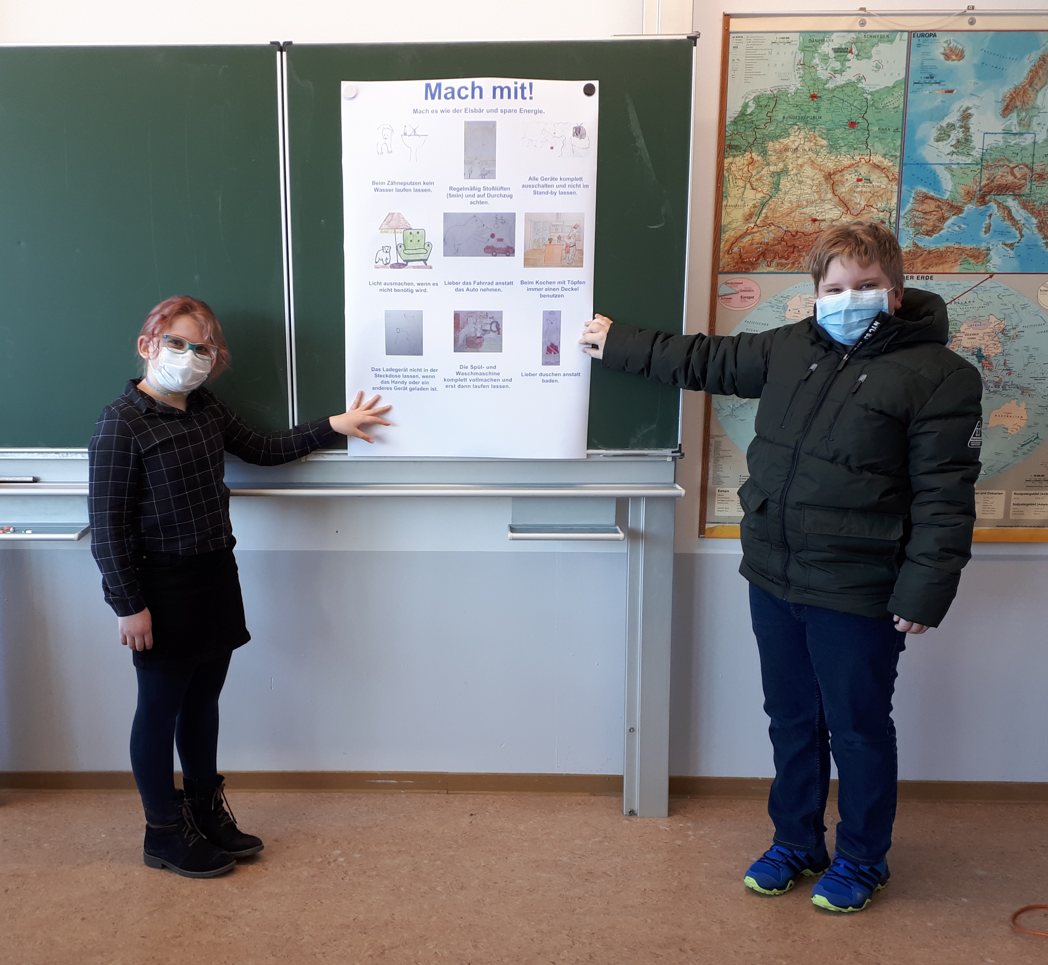 Passend zu diesen Tipps gestalteten sie im Kunstunterricht kreative Zeichnungen, die bei der Umsetzung helfen sollen. Die Bilder zeigen einen Eisbären, der lieber duscht anstatt badet, die Geräte nicht auf Standby lässt, beim Zähneputzen kein Wasser laufen lässt, etc.